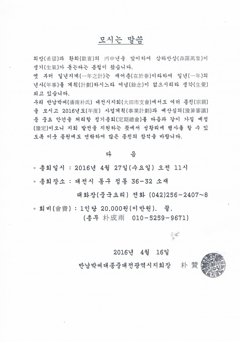 반남박씨 대종중 대전광역시 지회 총무 성우 입니다