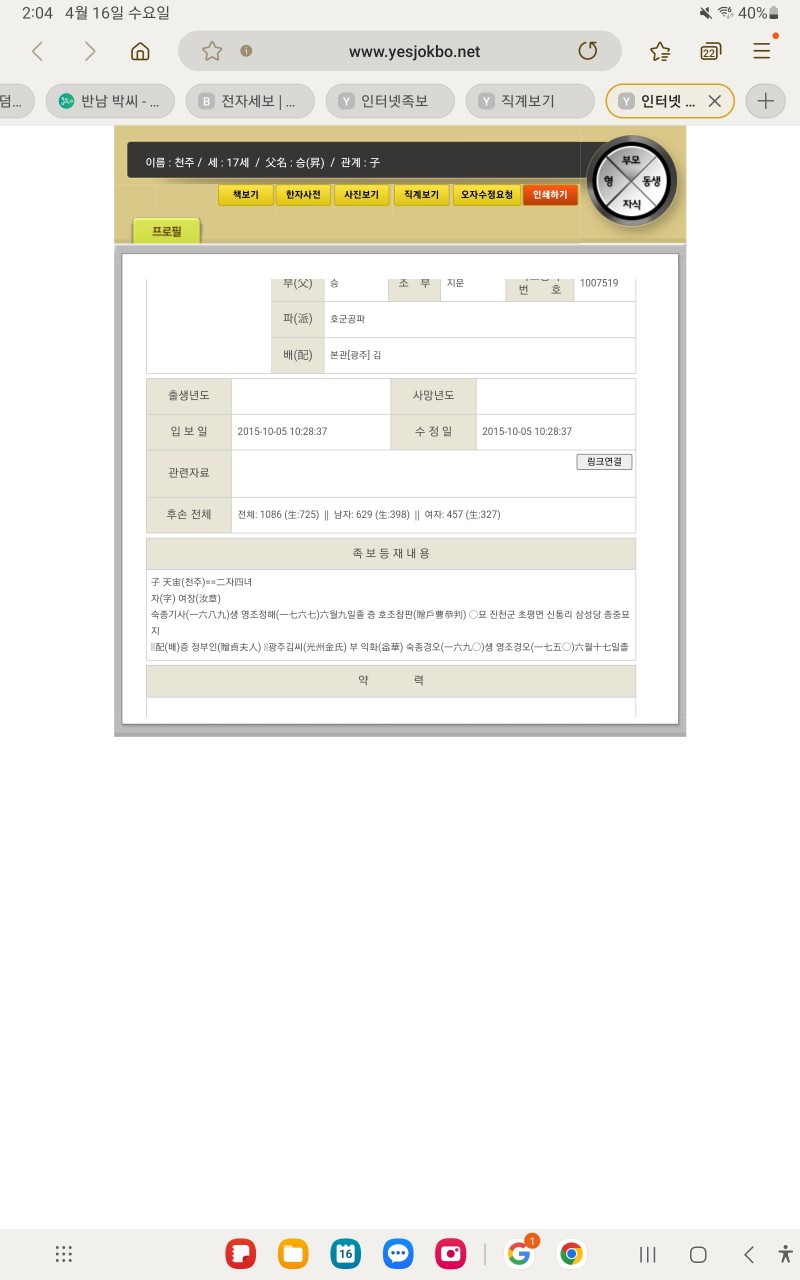 질문 | 반갑습니다 증직에 관해 궁금합니다 페이지 정보 시영쪽지보내기 메일보내기 자기소개 아이디로 검색 전체게시물쪽지보내기 메일보내기 자기소개 아이디로 검색 전체게시물 작성일25-04-16 14:03 조회472회 댓글0건 이전글 검색 목록 본문 반갑습니다~ 충북진천살고 찬 자 돌림쓰는 호군공 19세손 박찬준입니다. 저는 아직 족보에 이름이 올라와있지 않으나 찾아보니 조상에 천주라는 분이 계시더군요 휘 천주께선 생전관직을 하지 않으셨고 돌아가신 뒤에 증호조참판에 증직 되셨습니다. 이런건 특이한 경우입니까? 댓글목록 등록된 댓글이 없습니다. 이전글 검색 목록